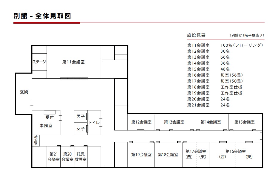 ![]() 別館は、当館本館東側、横断歩道を渡った正面に位置する平屋建ての施設です。 第11会議室から第21会議室までを備え、1時間単位での貸出を行っております。 利用内容は会議・研修・講習会・文化活動など多岐にわたっており、ご利用を検討されている場合はお気軽にご相談ください。 |